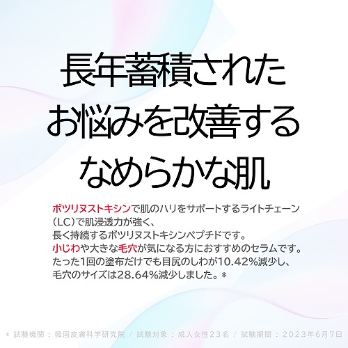 ① 先進のボツリヌストキシン由来成分:高い浸透力を誇るライトチェーン(LC)成分を採用。医薬品のボツリヌストキシンではなく、安全性を追求して組み替えられたタンパク質成分(※)を使用しているため、安心してエイジングケアを続けられます。