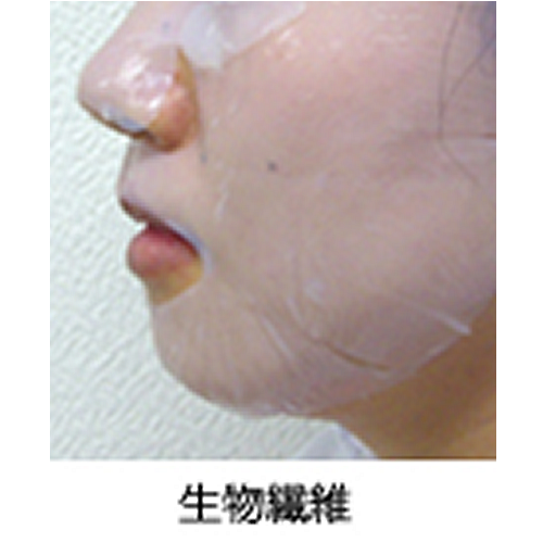生物繊維は火傷用の代替皮膚として開発されました。アメリカFDAに認可された食用菌を利用し発酵されております。自然界でもっとも細い繊維(2~100nm)で気体しか通さないため肌の呼吸に影響を与えません。繊維が細く穴がないため肌に完全密着する構造は、不織布のシートマスクの53%も美容液を吸収し、強力なODT効果で一気に美容液を肌へ吸収させます。また、たっぷり美容液を含んでも保水力が高いため、首への液ダレによる不快感がありません。使用後の生物繊維には美容成分が吸収された証として、肌理がハッキリと確認されます。